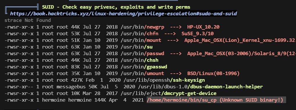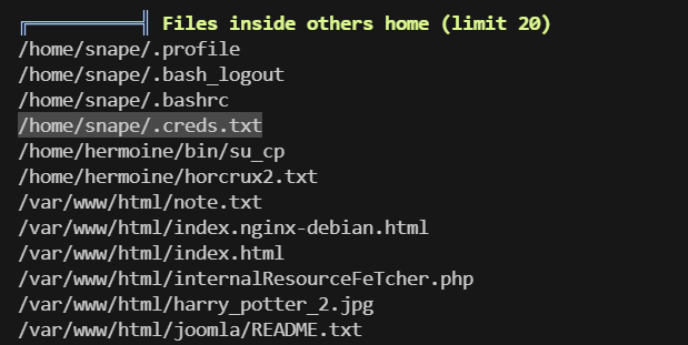 - 上传linpeas.sh进行提权信息收集,获得了snape的密码与hermonie的SUID文件,提权snape