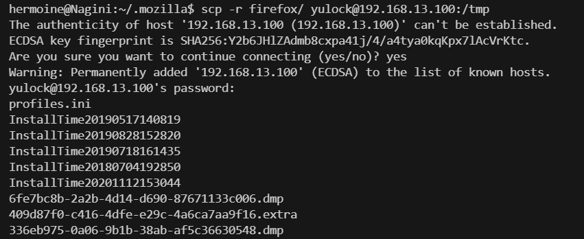 scp -r firefox/ yulock@192.168.13.100:/tmp
