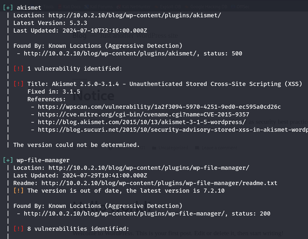 wpscan --url http://10.0.2.10/blog --api-token o7nP0PkBaFZnVzlR0R687BWAzsHrBifyxgLcmuluEaQ --plugins-detection aggressive --enumerate vp