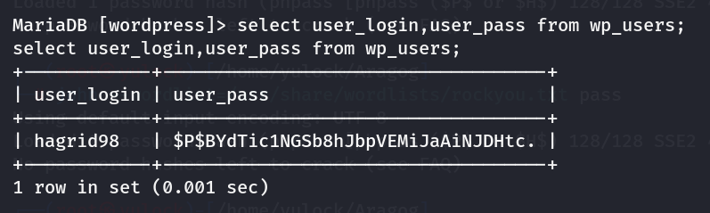 - 登陆数据库,查询到用户hagrid98的hash加密后的密码