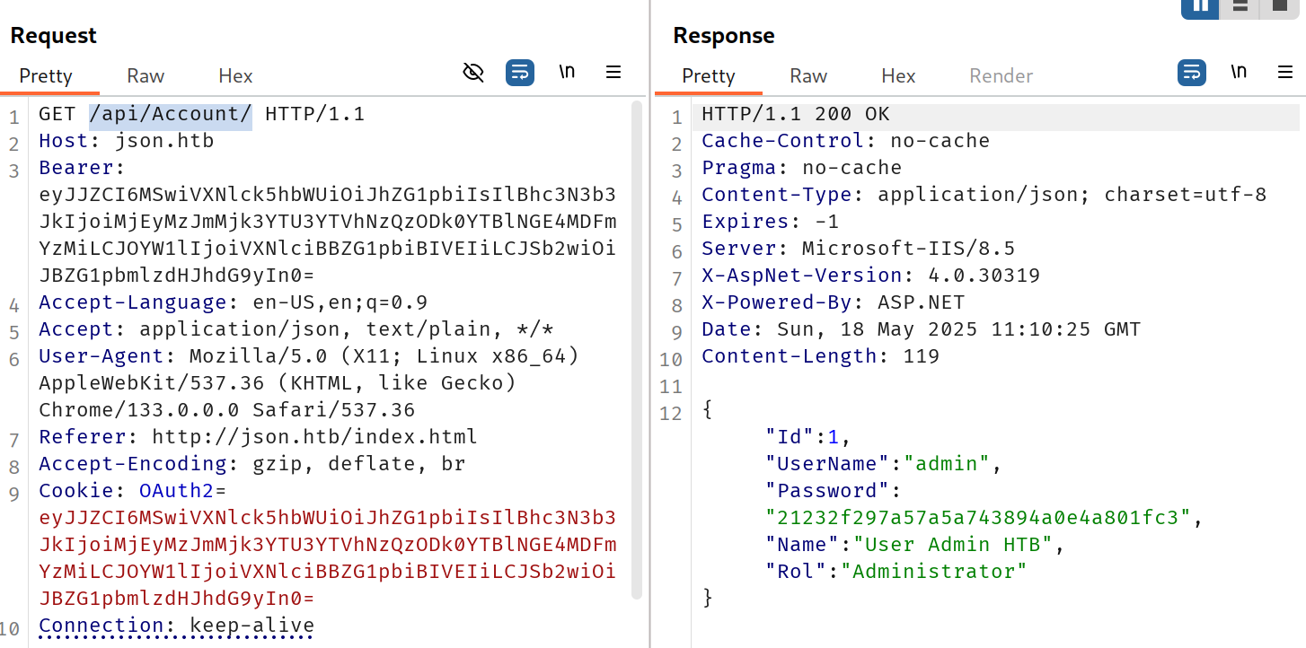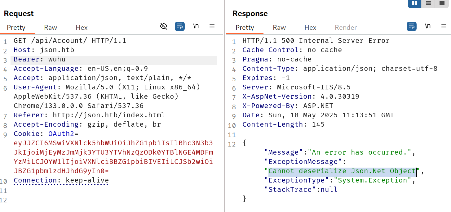 经测试,发现回显的json数据是通过base64解码请求头中的Bearer字段获得的,而在输入无法被解码的信息后,回显了关键报错信息