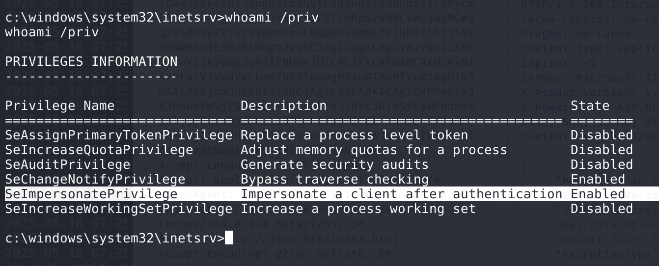 查看当前用户权限,可以发现存在SeImpersonatePrivilege权限且处于Enabled状态