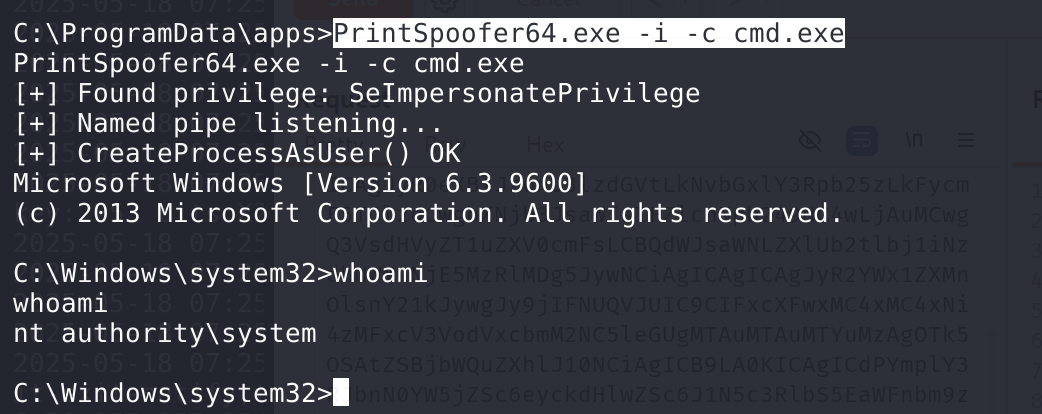 这里使用PrintSpoofer来进行提权,还是通过SMB传输文件,在目标主机上通过以下命令获取PrintSpoofer64.exe(建议在C:\ProgramData目录下操作,类似linux中的tmp目录,所有用户都有权限访问)
