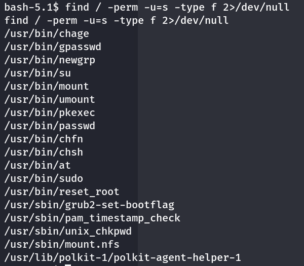 -perm:表示随后搜索的文件的权限-u=s:查找具有suid权限的文件-type f:表示查找的文件类型是常规文件,而非目录等2>/dev/null:将标准错误输出丢弃