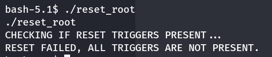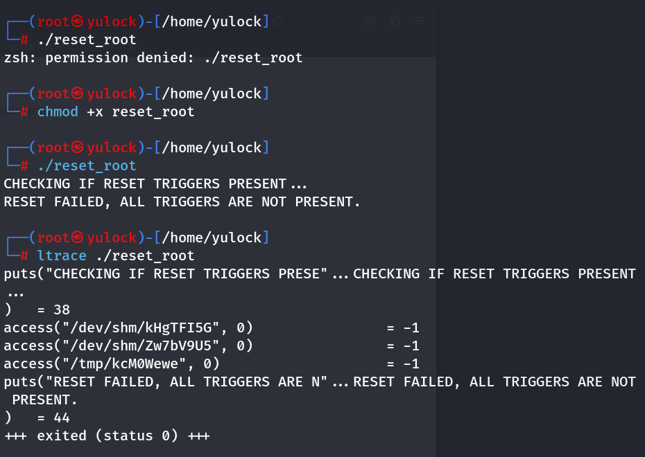 接着给本机上的reset_root赋予可执行权限,接着用ltrace查看该文件缺少哪些触发条件