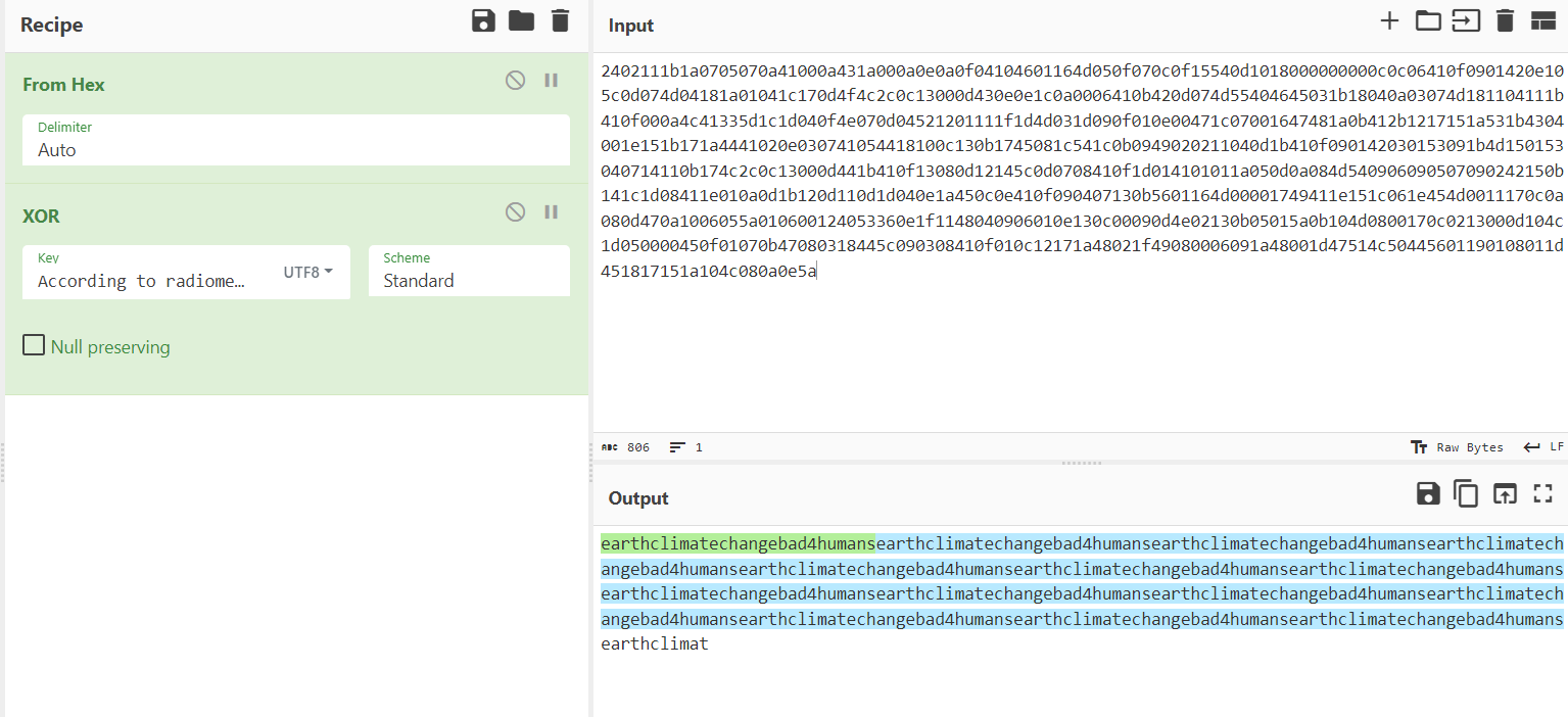 直接进行XOR解密会乱码,我们可以注意到原本的内容是十六进制格式的,说明在加密后又进行了一次十六进制编码才放在页面上,再进行一次十六进制解码即可