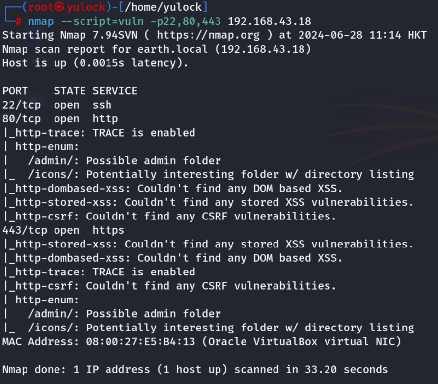 同时我们来看看已开放的服务上是否有常规漏洞的存在:nmap --script=vuln -p22,80,443 192.168.43.18