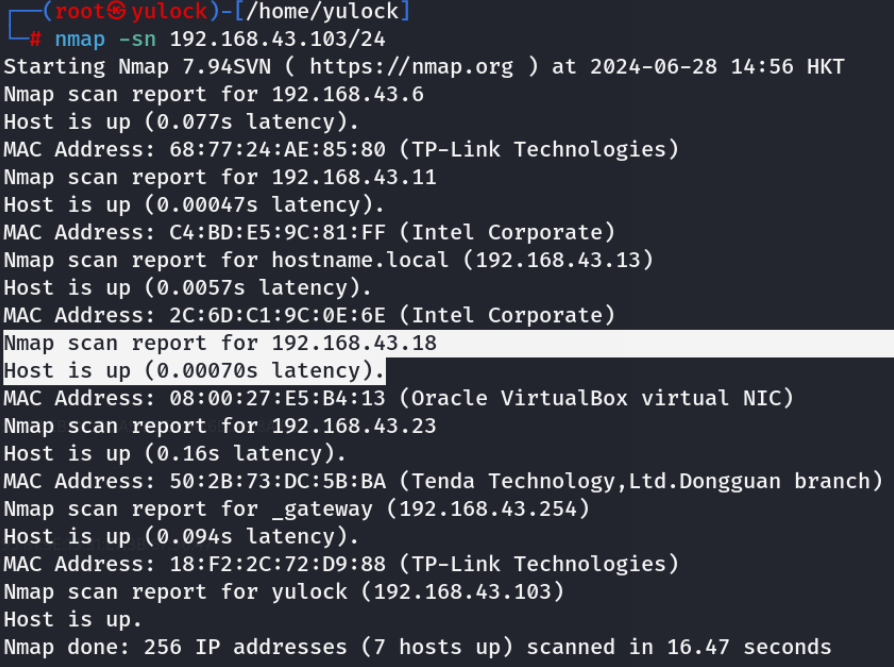 扫描当前当前网段存活主机:nmap -sn 192.168.43.103/24