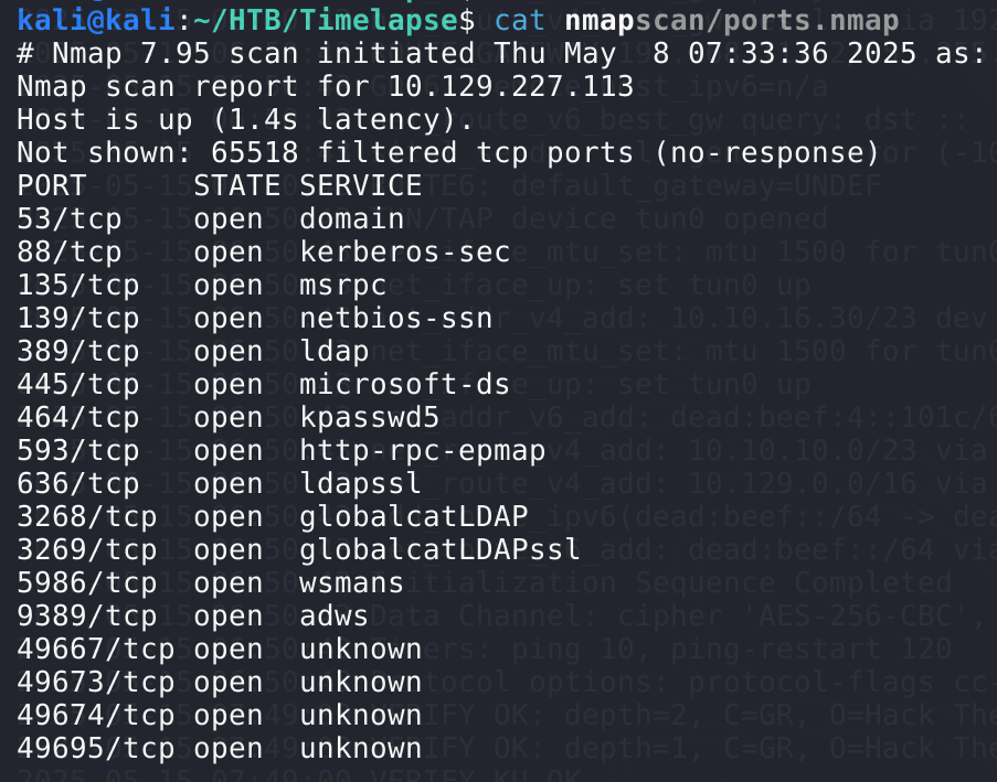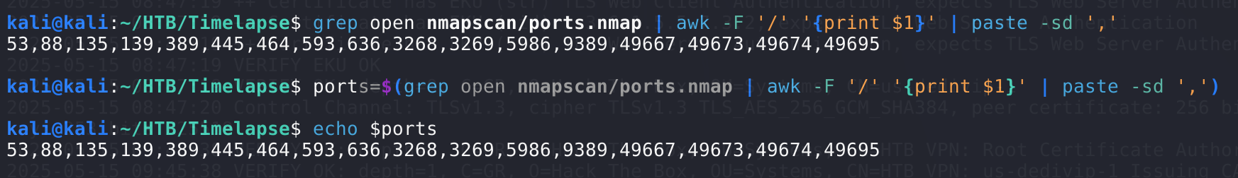 从端口开放情况可以判断这是一台域控,由于端口信息过多,进行其他扫描行为时手动输入不够优雅,这里学了一个处理输出结果的trick: