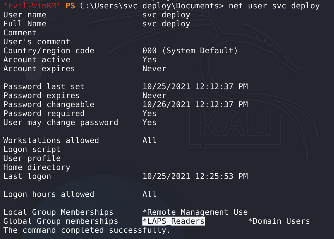 提权:用ps历史中发现的密码登录srv_deploy->发现用户组有LAPS_Readers_>读取admin密码提权
