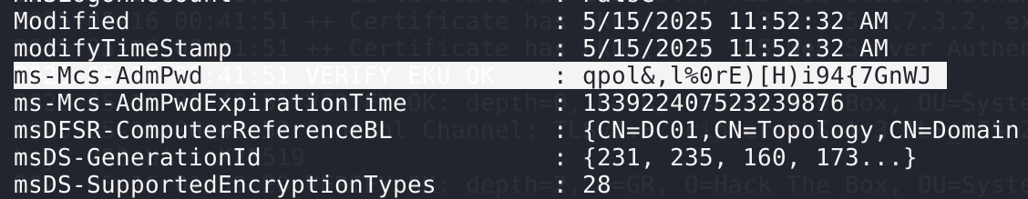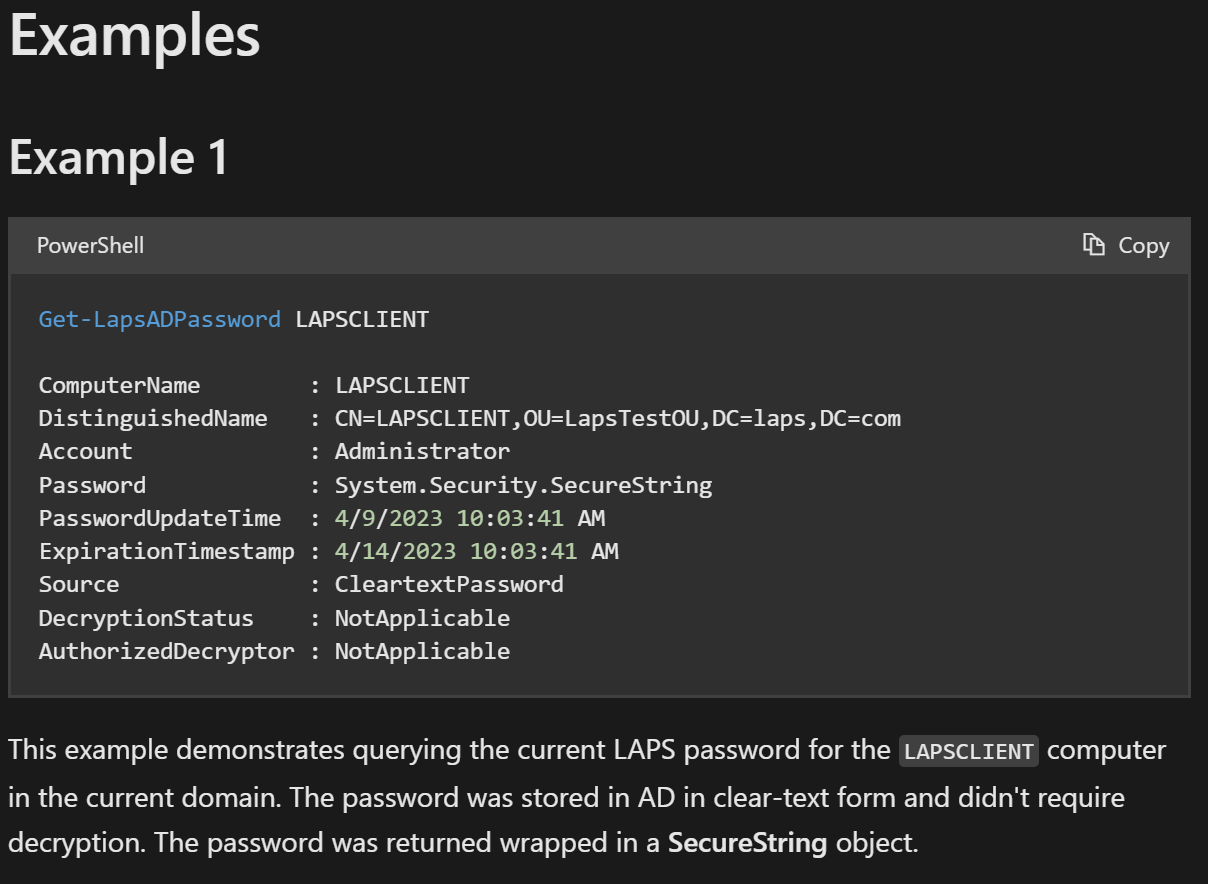 由于当前用户有LAPS权限,因此尝试使用官网的命令去读取