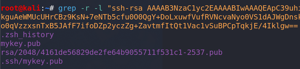 由于爆破的key字典是公钥和私钥的结合,因此猜测之前获得的mykey.pub中的内容也包括在其中,使用grep命令进行查找,成功获取到与之前获取到的公钥相对应的私钥