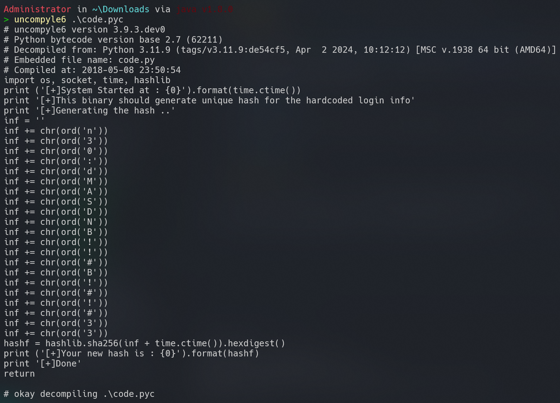用python开http服务将其拉取到本地,并将其重命名后缀为pyc,使用uncompyle6进行反编译