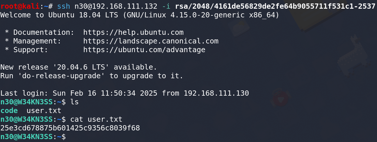 指定对应的私钥进行ssh登录root未果,尝试登录n30成功,在用户目录下获取到第一个flag