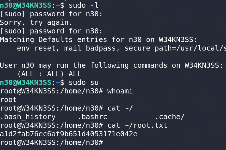sudo -l发现权限为ALL,直接sudo su提权root,在root用户目录下获取到第二个flag