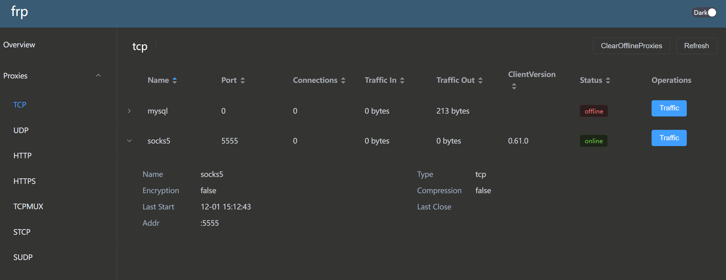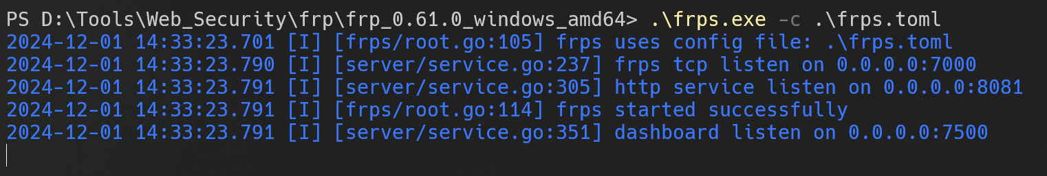 命令frps.exe -c ./frps.toml启动服务端,可通过127.0.0.1:7500访问管理后台