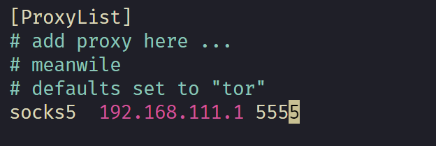 修改/etc/proxychains4.conf配置文件,在底部添加socks5 192.168.111.1 5555