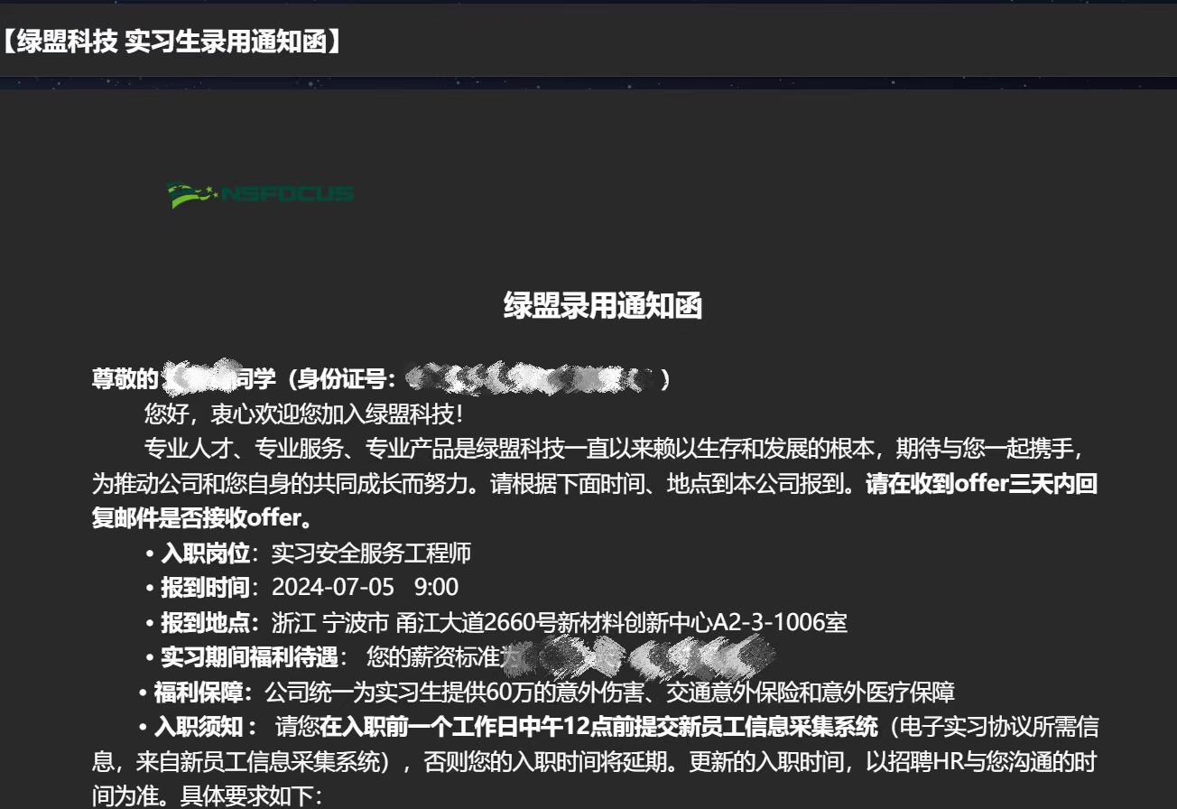 争取到了暑假在宁波绿盟实习的机会,现在想来并不是我的技术能力达到了要求,仅仅只是因为我走的比其他和我一起面试的人稍远罢了。